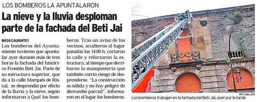 Madril, Espainia. Espainiako hiriburuko Beti-Jai kantxa salbatzeko sortu zen plataforma herritarrak bere kezka eta arrengura azaldu du, joan den asteartean erori egin baitira eraikinaren aitzinaldeko zati batzuk. Suhiltzaileak agertu behar izan zuten 1893an Joaquin Rucoba arkitektoak estilo mudejarondokoan egindako kantxa bakarra den hau arriskurik gabeko moduan utzi arte.