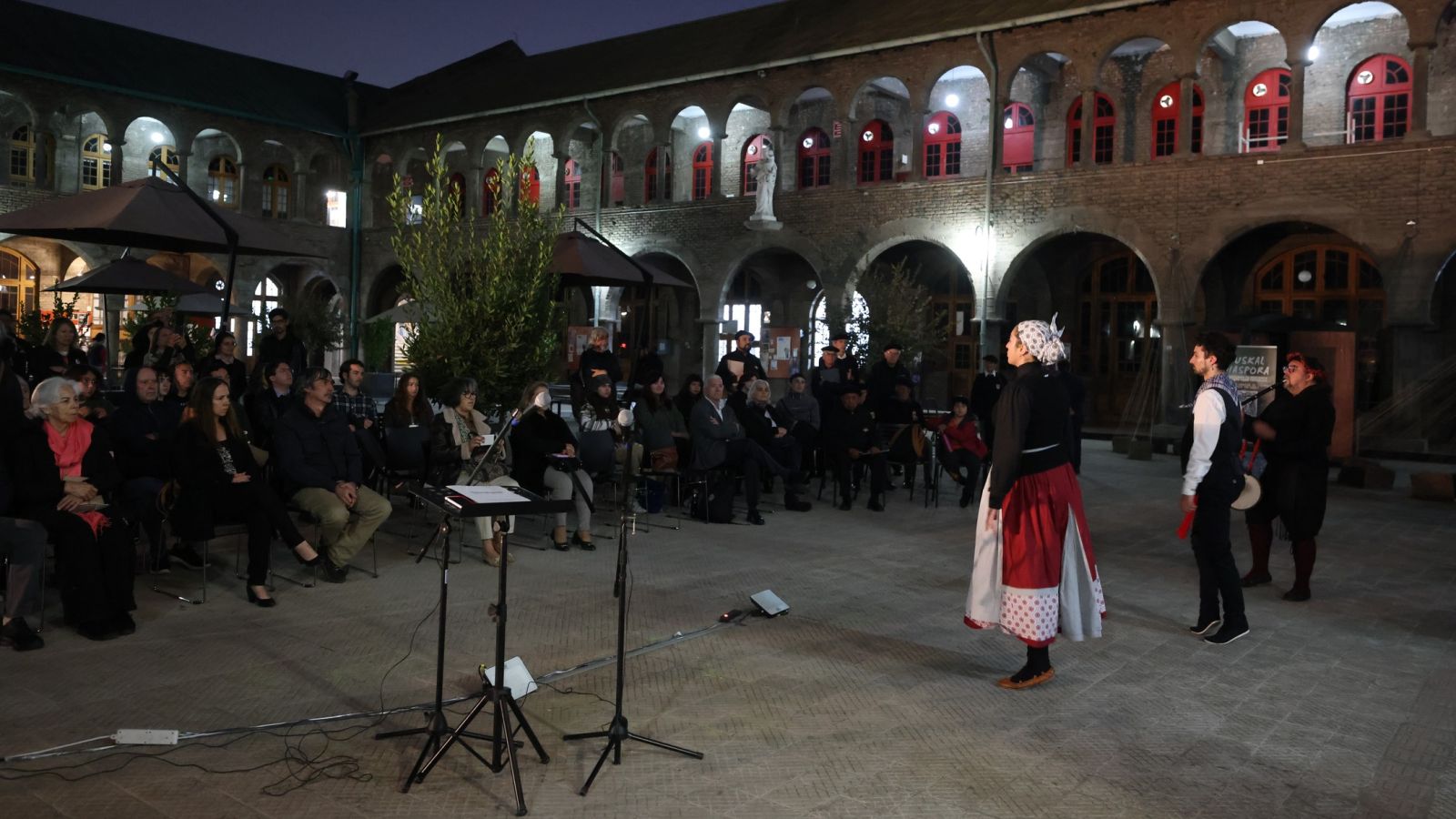 Txileko Euskal Gizataldea Elkarteko dantzariak eta Angel Espinoza txistularia, 'Gernikako bonbardaketaren 89. urteurrena: artea, estetika, memoria eta giza eskubideak' ekitaldiaren inaugurazio ekitaldian (argazkia César Dellepiane)