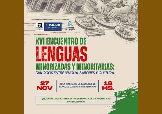 Córdoba, Argentina. Cordobako Gerora euskal kultura elkarteak hizkuntza aniztasuna ospatzeko urtero antolatzen duen hitzorduaren edizio berri bat egingo du datorren ostegunean, azaroaren 27an. Izan ere, Cordobako Unibertsitate Nazionaleko (UNC) Hizkuntzen Fakultateko Areto Nagusiak 'XVI. Hizkuntza gutxitu eta eremu urriko hizkuntzen topaketa. Hizkuntza, Zapore eta Kulturen arteko elkarrizketak' izenpeko saioari emango dio abegia, 16 urteko ibilbidearekin bertako gizataldeentzat erreferentzia gisa finkatu den espazioa.