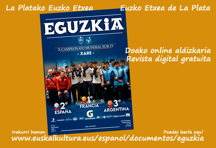 La Plata, Buenos Aires. Kalean da dagoeneko, eskuragarri online, La Platako Euzko Etxearen Eguzkia hiruhilabetekariaren zenbaki berria, aldi honetako 8. urteko 32.a, abenduari dagokiona. Bere 89 orrialdeetan, azken hilabeteotako laburpena eta datozen hilabeteotarako iragarpena topa ditzakezu, euskal kultura, kirola, Diaspora eta hainbat gairi buruzko artikulu eta sinadurak barne. Abenduro bezala, 32. zenbaki honek gehigarri bat ere badakar, gaur bertan edo edonola ere urte bukatu aurretik hona ekarriko duguna, labean baitago bere puntua hartzen, bertatik ateratzeko ia prest.