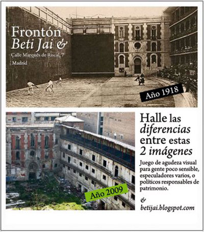 Madril, Espainia. "Salvemos el Frontón Beti-Jai de Madrid" plataformako kideak pozik agertu dira egunotan, Madrilgo Komunitateak kultura-ondasun izaera aitortu baitio frontoi madrildarrari. Deklarazioa Madrileko Komunitatearen Agintaritzaren Aldizkarian argitaratu dute (testu osoa hemen) eta aitorpen honi esker frontoiak eraisteari izkin egingo dio. Momentuz.